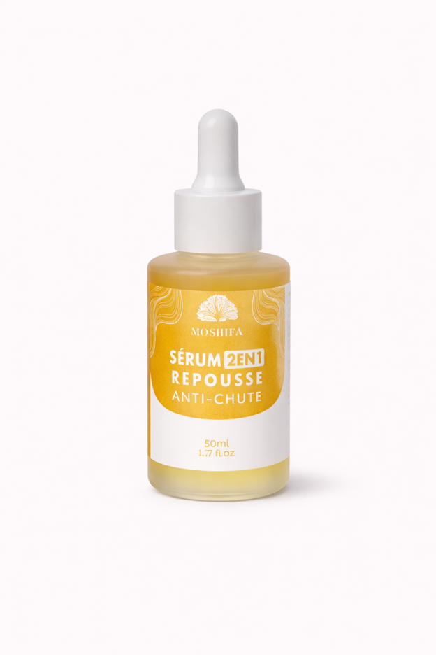 Le Sérum Repousse & Anti-Chute 2 en 1 Mo’shifa est un soin capillaire formulé pour aider à renforcer les racines, stimuler la croissance des cheveux et réduire la chute capillaire.